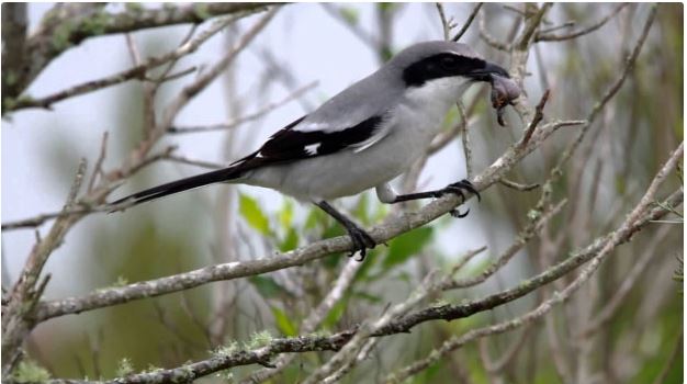 One of the most unsettling behaviors of the loggerhead shrike is its habit of pinning its prey to thorns, barbed wire, or sharp sticks. Without the powerful talons of a hawk or an eagle, this bird has evolved to use the environment as a substitute tool. Once it has caught an insect, small mammal, amphibian, reptile, or even another bird, it drives the body onto a sharp object to immobilize and dismember it.